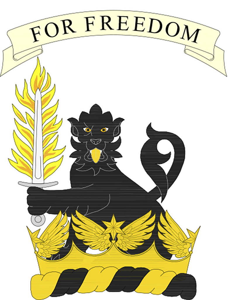 Blazon: Issuant from an astral crown Or a lion sejant guardant Sable armed and langued Or holding in the sinister forepaw a sword enflamed as in the arms.