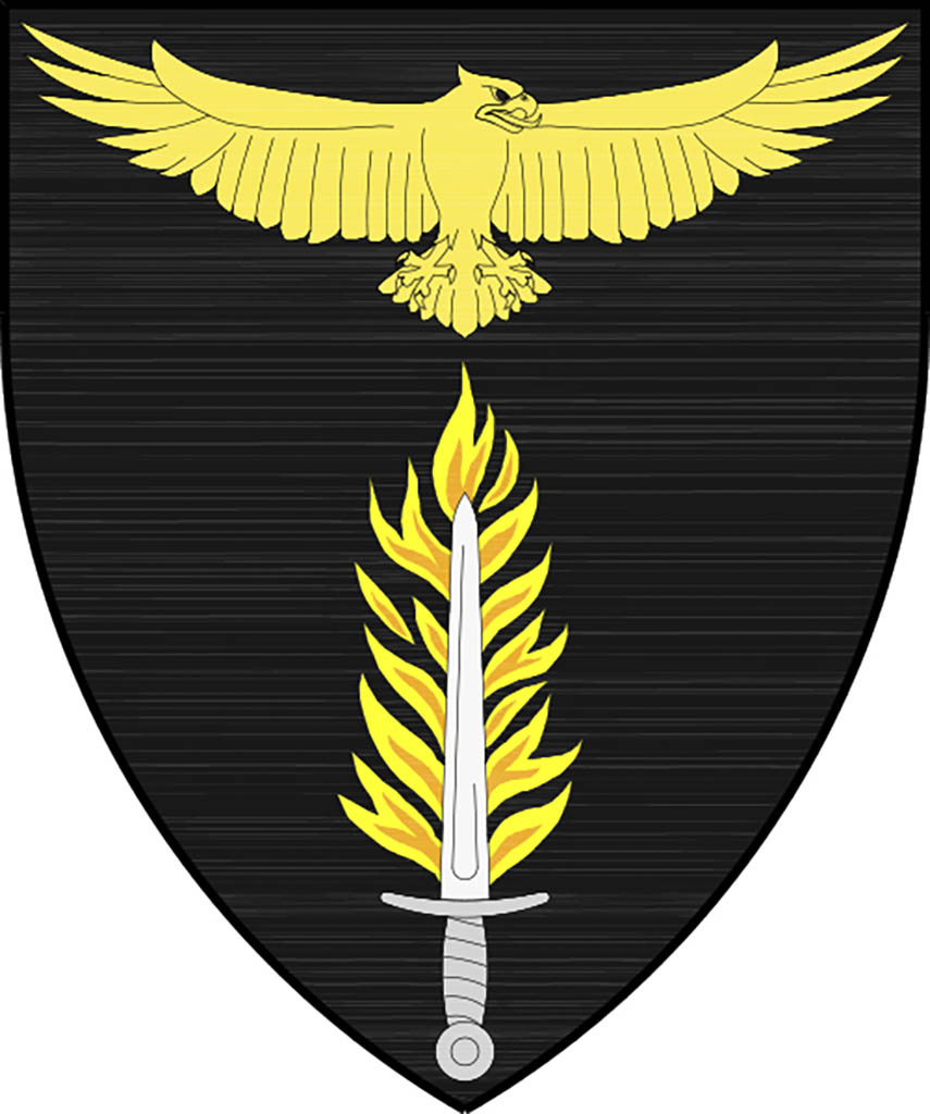 Arms: Sable a sword enflamed palewise all Proper in chief an eagle affrontée volant head to sinister Or.