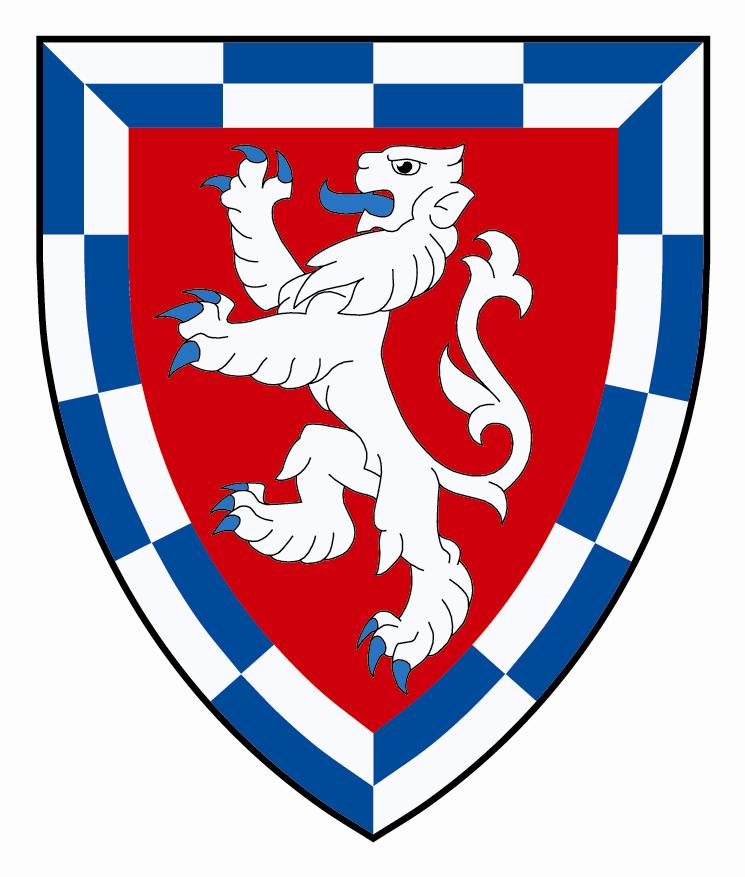 Blazon: Gules a lion rampant argent within a bordure counter-compony argent and azure.