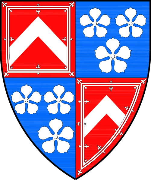 Blazon of arms: Quarterly: 1st and 4th, gules, a chevron within a double tressure counter-flowered Argent (for Fleming); 2nd and 3rd, Azure, three frases (cinquefoils) Argent (for Fraser)